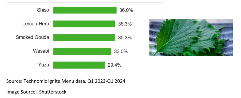 Shiso, an aromatic herb with a citrusy taste, tops the list of fastest-growing flavours at Canadian FSRs. The Japanese herb is appearing in sushi and sashimi. Another Japanese flavour increasing on Canadian full-service menus is wasabi. The plant is most often made into a spicy green condiment, which is frequently served alongside sushi.