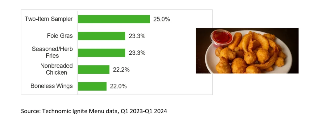 Two-item samplers top the list of fastest-growing appetizers, a combo offering that provides value. These samplers appear in several varieties, including double protein offerings, double veggie offerings or a mix of a protein and a veggie.